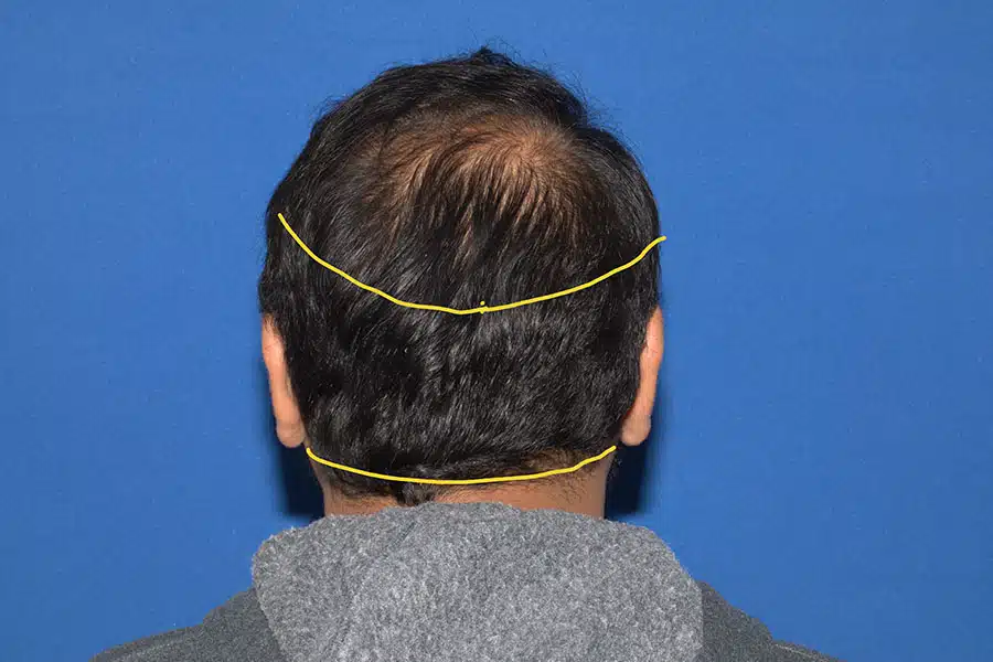 In short, the hair that is surgically transplanted—from the donor area to the recipient area—is resistant to DHT, the hormone responsible for male pattern baldness, making it permanent. The donor zone, from which the follicles are extracted, is known as the safe donor zone. The photo below shows a patient with an advanced balding pattern, with the safe donor zone highlighted by yellow lines.